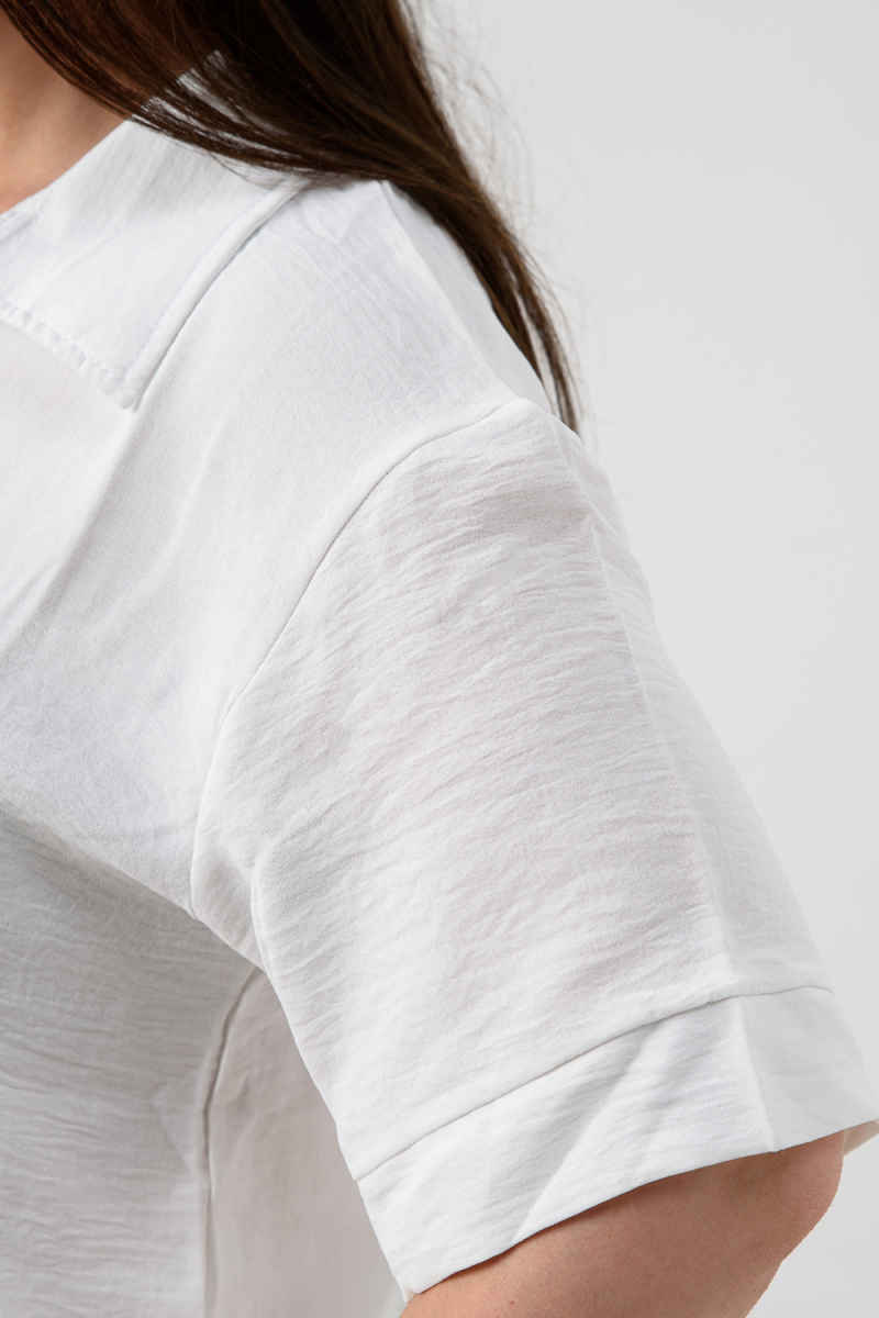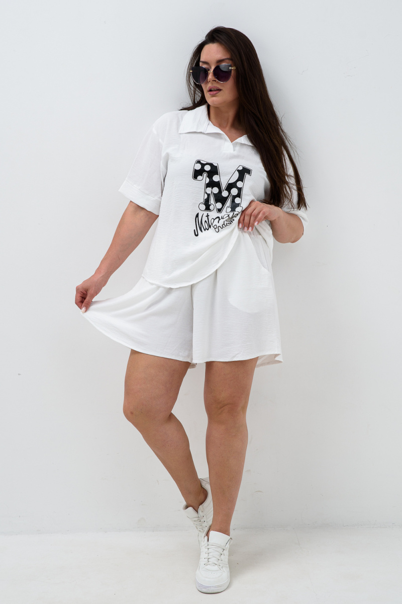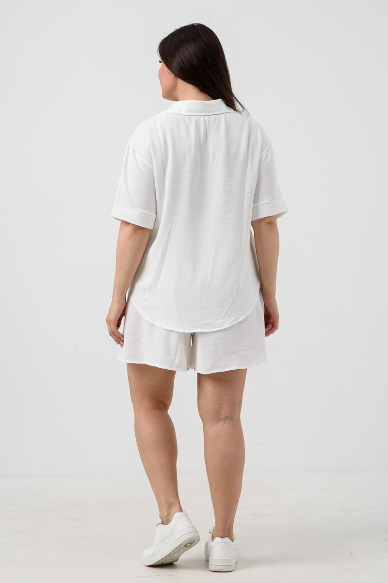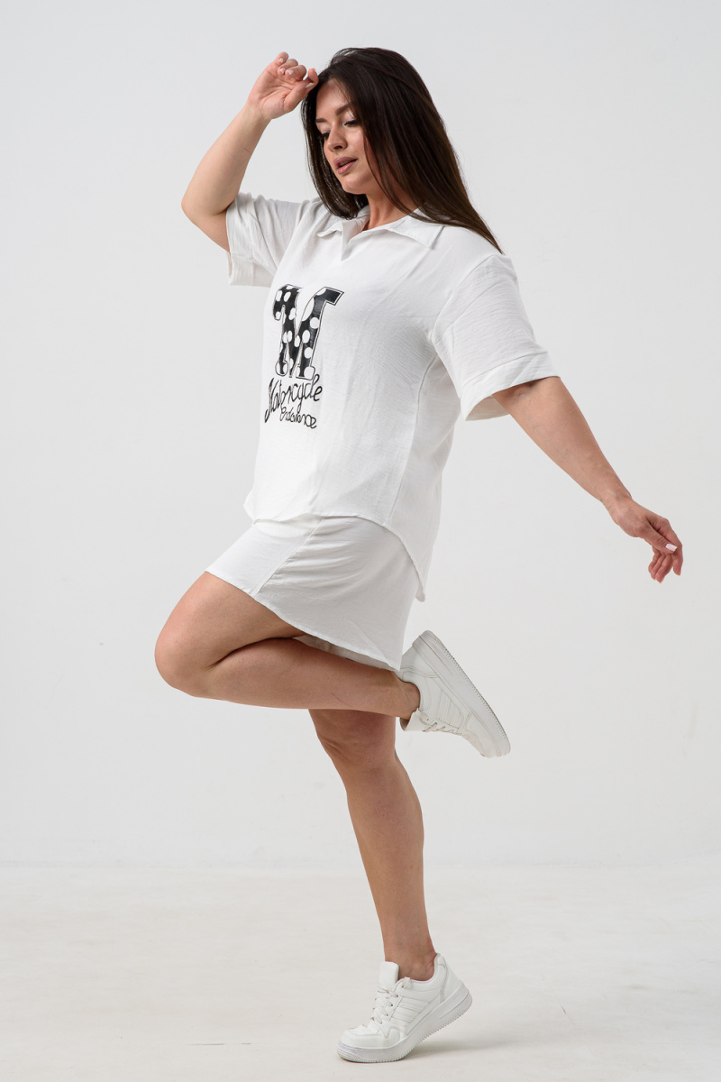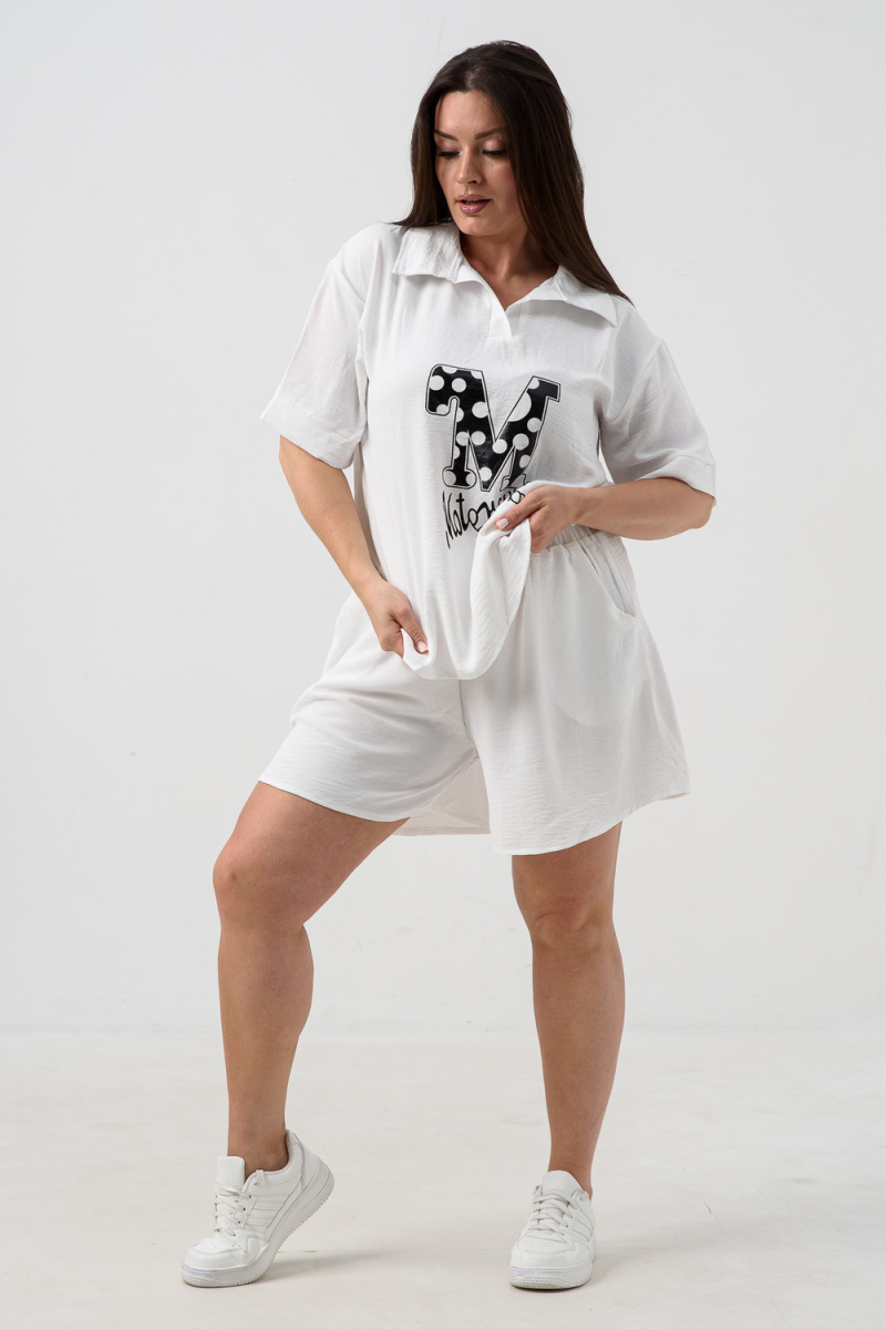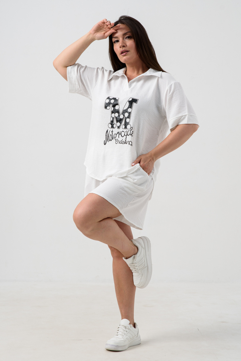 Представляем вам новинку - женский костюм-двойка, состоящий из футболки и шорт. Наряд состоит из свободной футболки-рубашки с однотонным принтом и шорт свободного кроя на резинке. Для удобства шорты имеют 2 кармана.