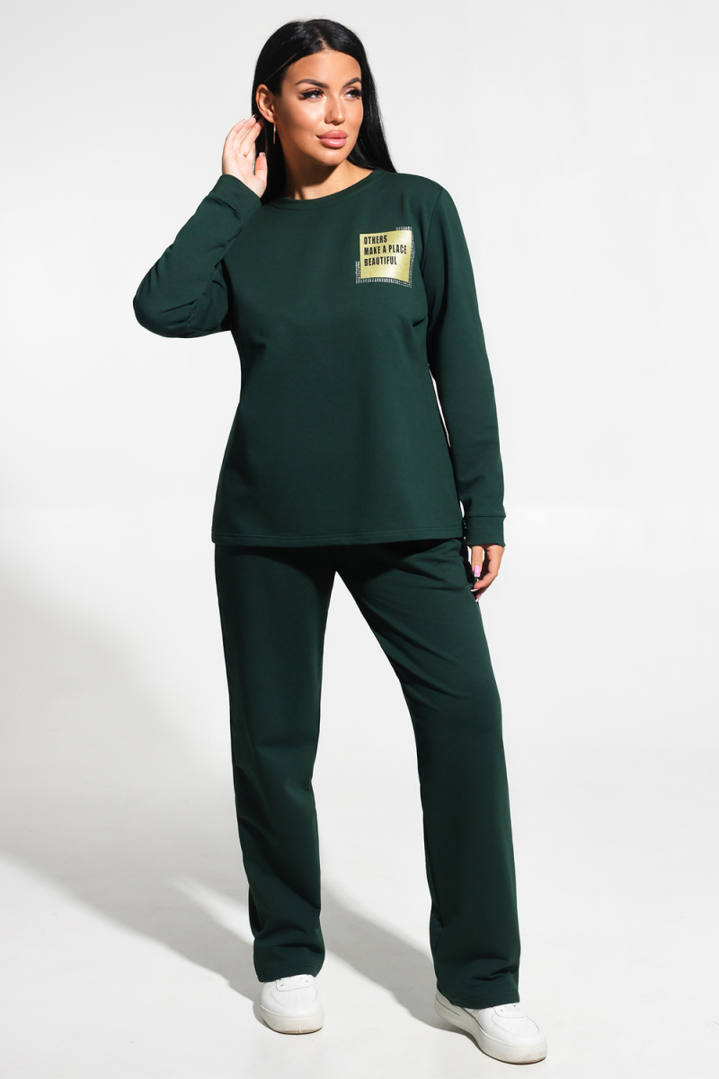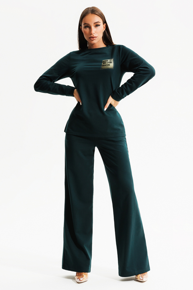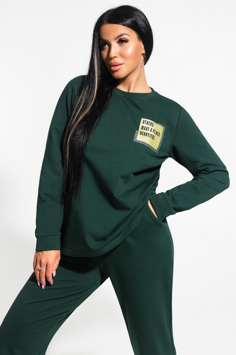 Костюм женский из футера 2 нитки, состоит из туники и брюк. Туника полуприлегающего силуэта, длиной до бедер, рукав втачной, длинный, с манжетой по низу. Горловина округлой формы с обтачкой. По переду нанесен дизайнерский принт. Брюки прямые, свободные, длинные. Притачной пояс на резинке, внутренние боковые карманы с наклонным входом.