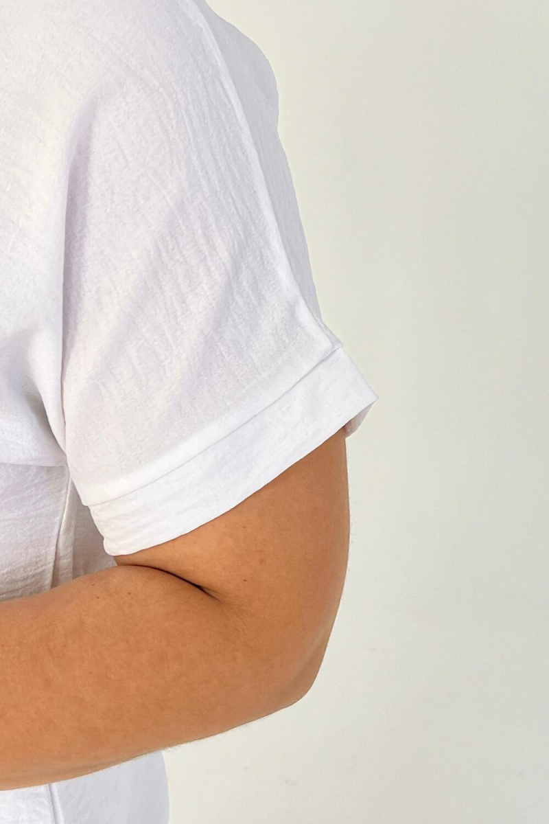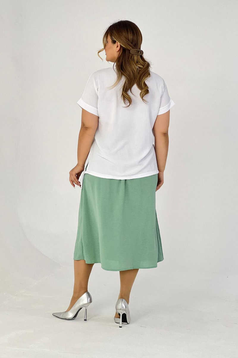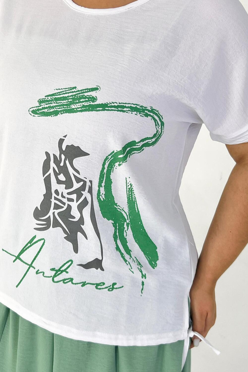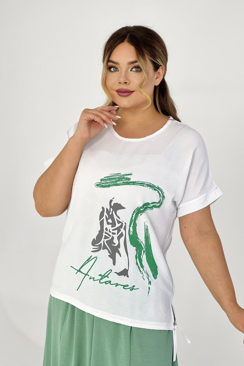 Женская двойка прямого силуэта. Верх комплекта в белом цвете с цветным принтом, короткий цельнокроеный рукав, низ футболки имеет свойство затягиваться, поэтому ее можно носить спущенную на юбку, а можно затянуть и оставить над ней, что подчеркнет вашу талию. Низ - свободная юбка двух цветов, с двумя разрезами снизу. Костюм повседневный и удобный, из легкой ткани сингапур, что хорошо для жаркого лета.